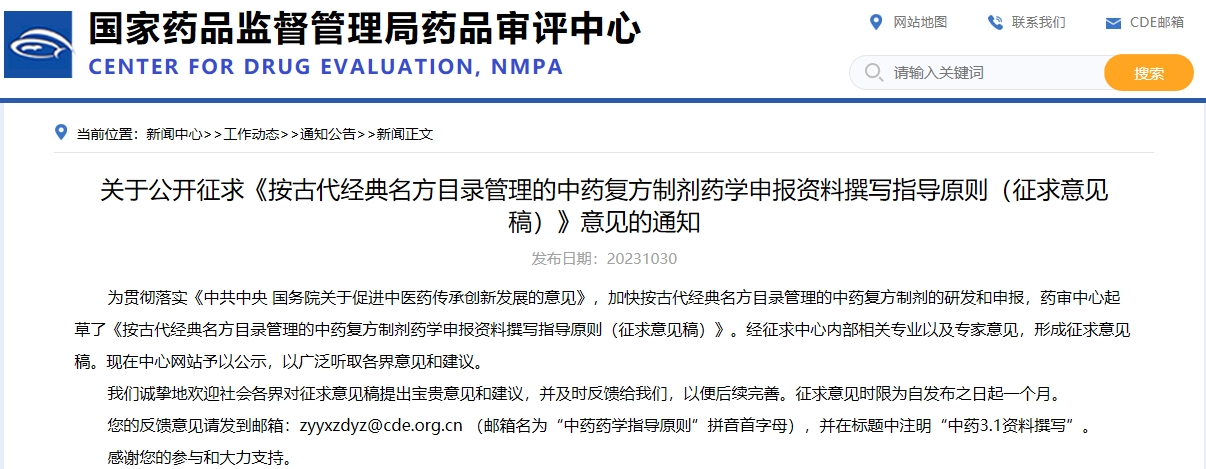 關(guān)于公開征求《按古代經(jīng)典名方目錄管理的中藥復(fù)方制劑藥學(xué)申報(bào)資料撰寫指導(dǎo)原則(征求意見稿)》意見的通知