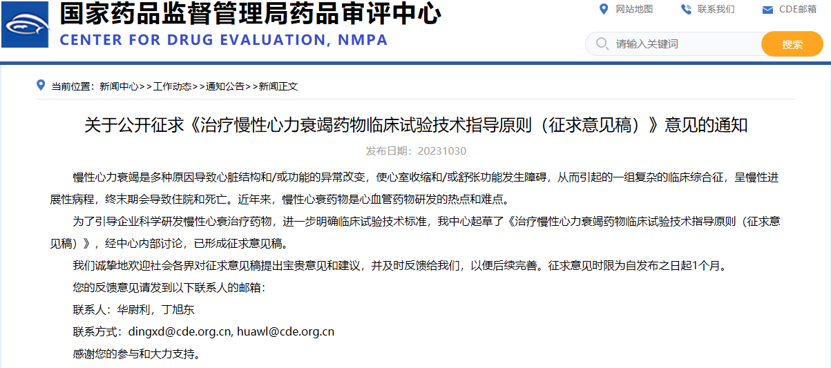 關(guān)于公開征求《治療慢性心力衰竭藥物臨床試驗(yàn)技術(shù)指導(dǎo)原則(征求意見稿)》意見的通知