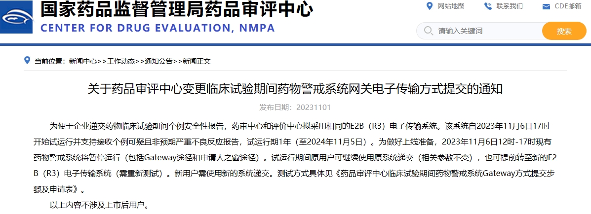 關(guān)于藥品審評中心變更臨床試驗(yàn)期間藥物警戒系統(tǒng)網(wǎng)關(guān)電子傳輸方式提交的通知
