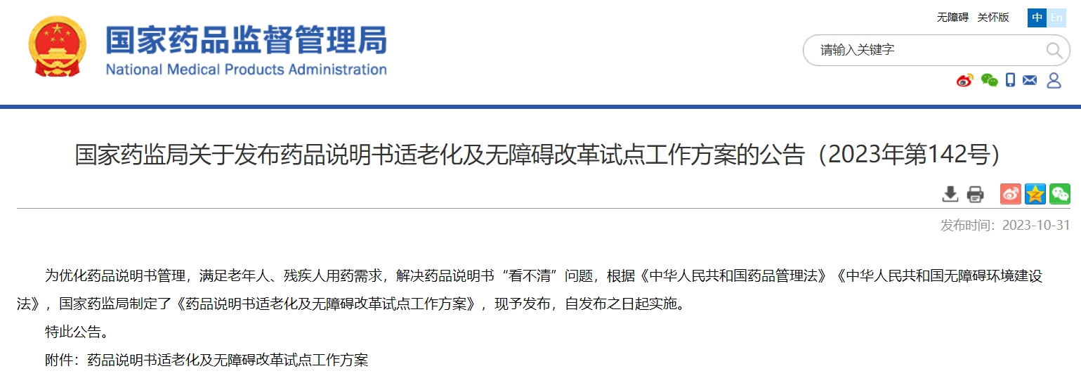 國家藥監(jiān)局關(guān)于發(fā)布藥品說明書適老化及無障礙改革試點(diǎn)工作方案的公告(2023年第142號)