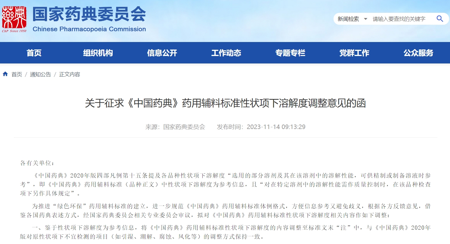 關(guān)于征求《中國藥典》藥用輔料標(biāo)準(zhǔn)性狀項(xiàng)下溶解度調(diào)整意見的函