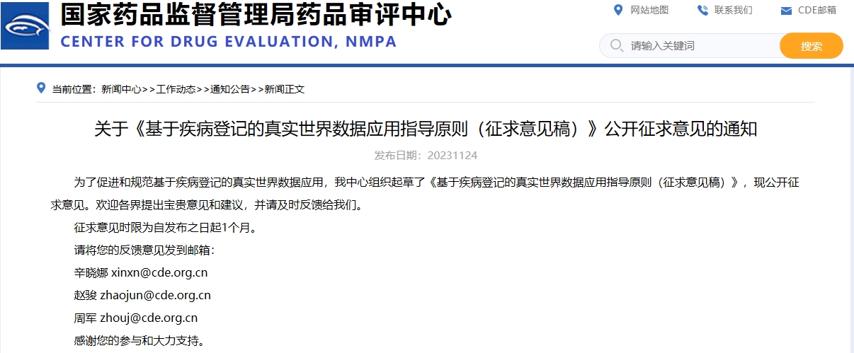 關于《基于疾病登記的真實世界數(shù)據(jù)應用指導原則(征求意見稿)》公開征求意見的通知