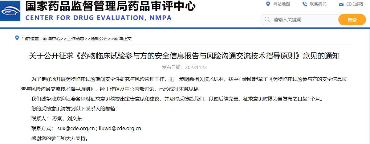 關于公開征求《藥物臨床試驗參與方的安全信息報告與風險溝通交流技術指導原則》意見的通知
