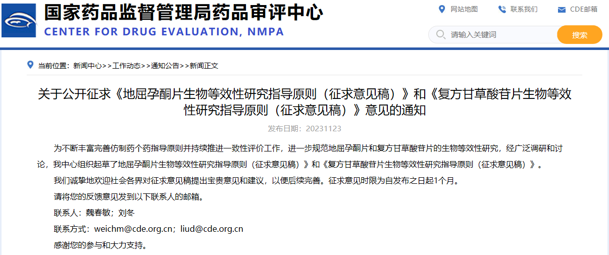 關于公開征求《地屈孕酮片生物等效性研究指導原則(征求意見稿)》和《復方甘草酸苷片生物等效性研究指導原則(征求意見稿)》意見的通知