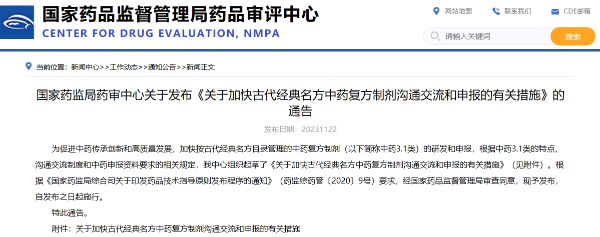 國家藥監(jiān)局藥審中心關于發(fā)布《關于加快古代經(jīng)典名方中藥復方制劑溝通交流和申報的有關措施》的通告