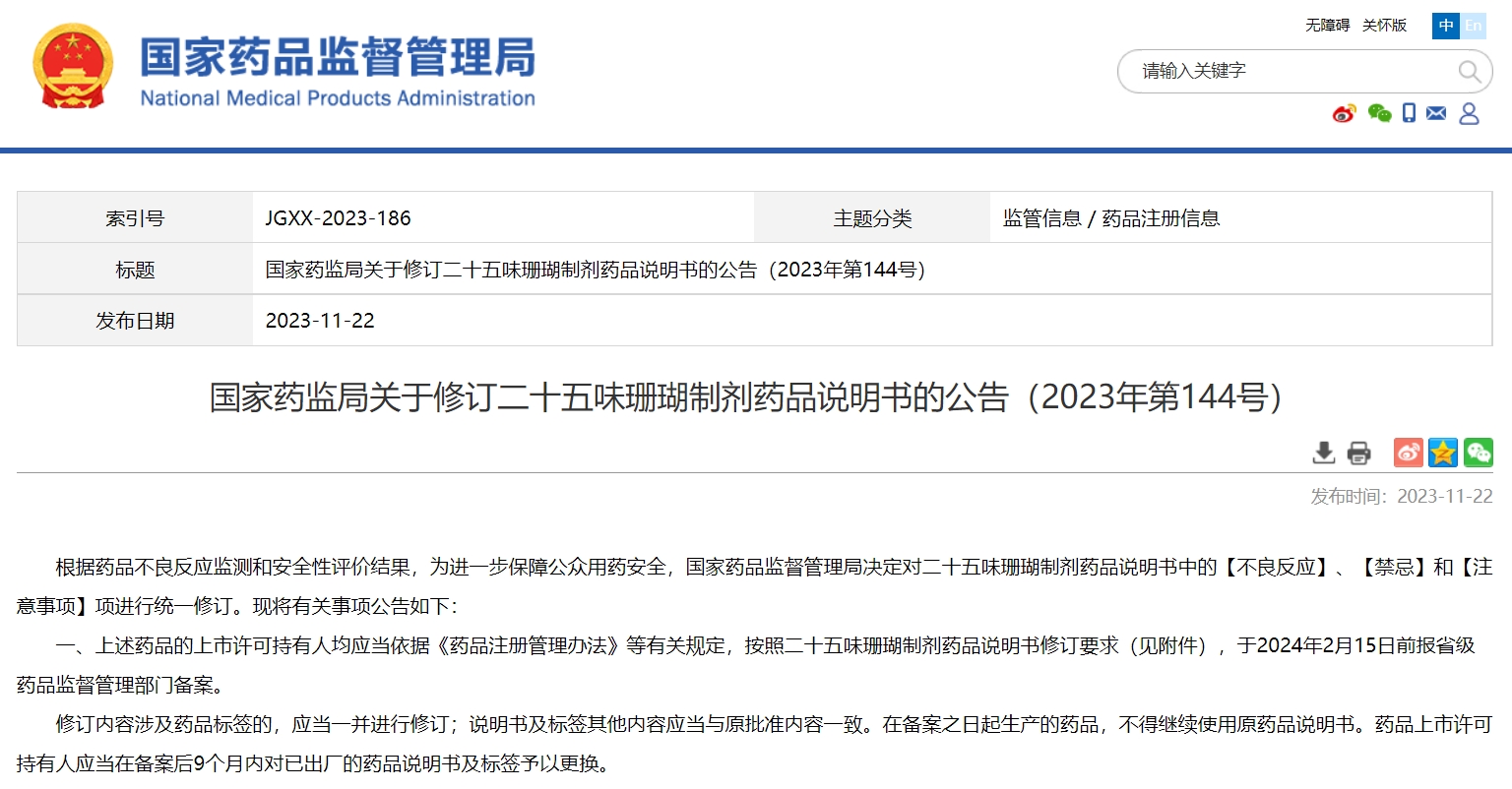 國家藥監(jiān)局關于修訂二十五味珊瑚制劑藥品說明書的公告(2023年第144號)