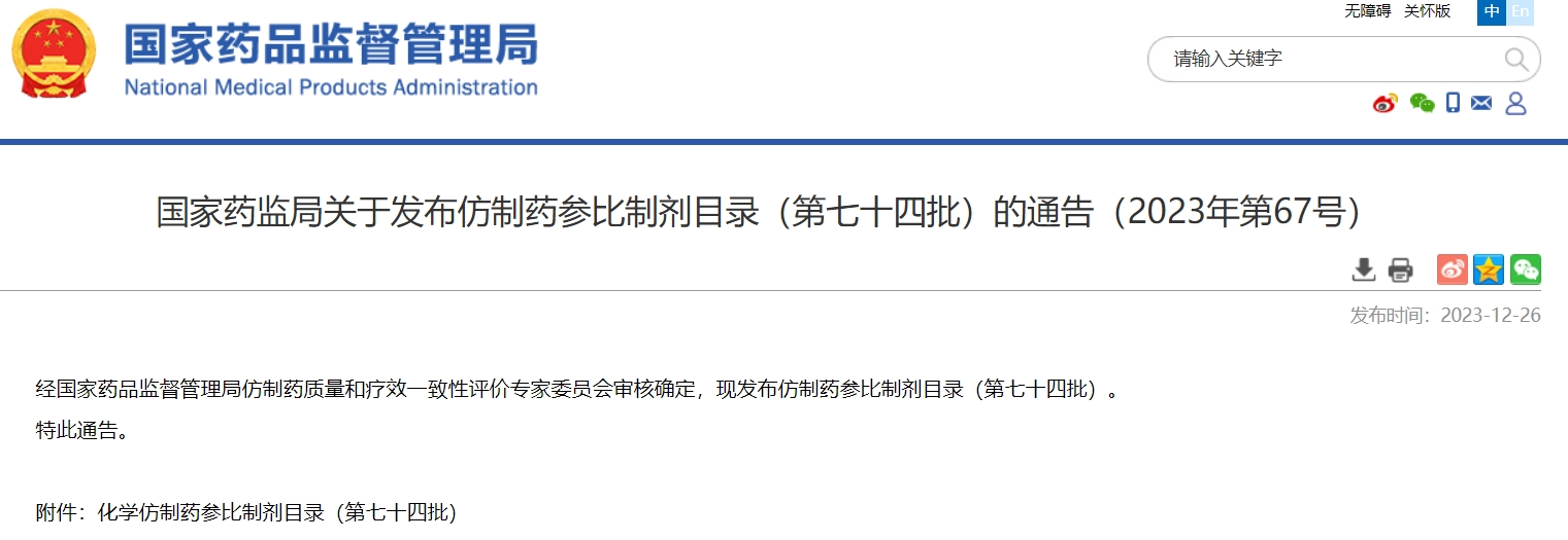 國(guó)家藥監(jiān)局關(guān)于發(fā)布仿制藥參比制劑目錄(第七十四批)的通告(2023年第67號(hào))