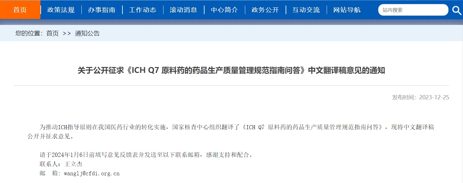 關(guān)于公開(kāi)征求《ICH Q7 原料藥的藥品生產(chǎn)質(zhì)量管理規(guī)范指南問(wèn)答》中文翻譯稿意見(jiàn)的通知