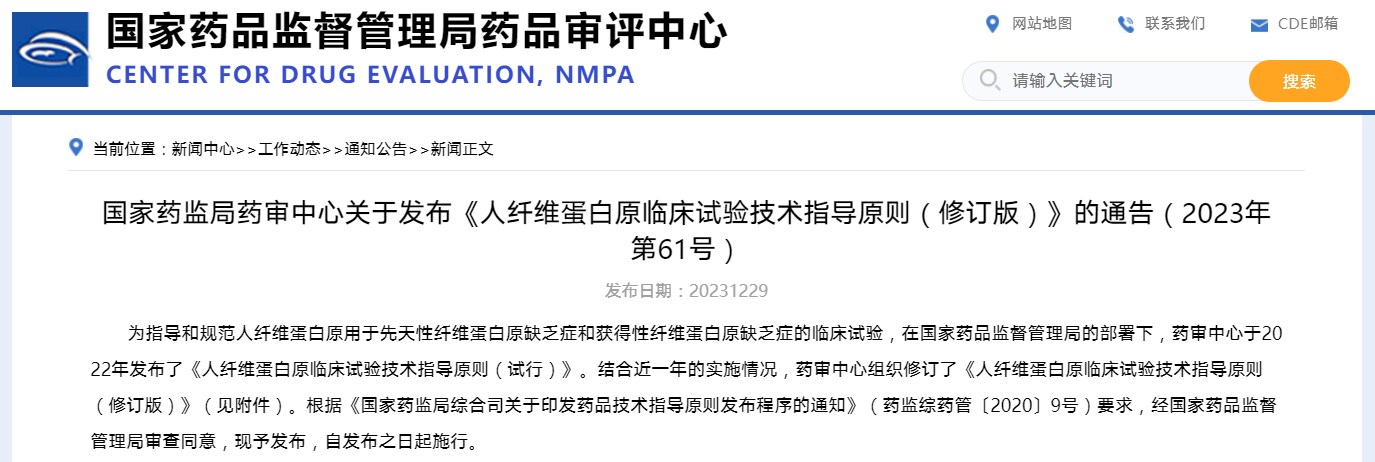國家藥監(jiān)局藥審中心關(guān)于發(fā)布《人纖維蛋白原臨床試驗技術(shù)指導(dǎo)原則(修訂版)》的通告(2023年第61號)