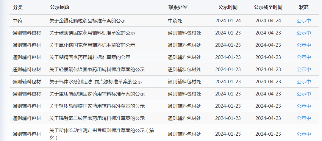 本周藥典委發(fā)布關(guān)于金銀花顆粒等5個(gè)品種藥品標(biāo)準(zhǔn)草案,碳酸鎂等5個(gè)品種藥用輔料標(biāo)準(zhǔn)草案,以及關(guān)于粉體流動(dòng)性測(cè)定指導(dǎo)原則標(biāo)準(zhǔn)草案、藥品包裝用陶瓷吸水率測(cè)定法標(biāo)準(zhǔn)草案、藥品包裝用陶瓷瓶及組件通則的公示。
