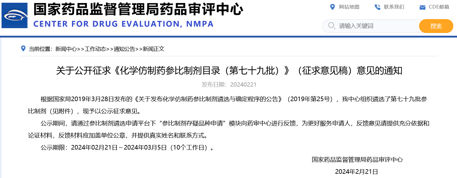 關(guān)于公開征求《化學(xué)仿制藥參比制劑目錄(第七十九批)》(征求意見稿)意見的通知
