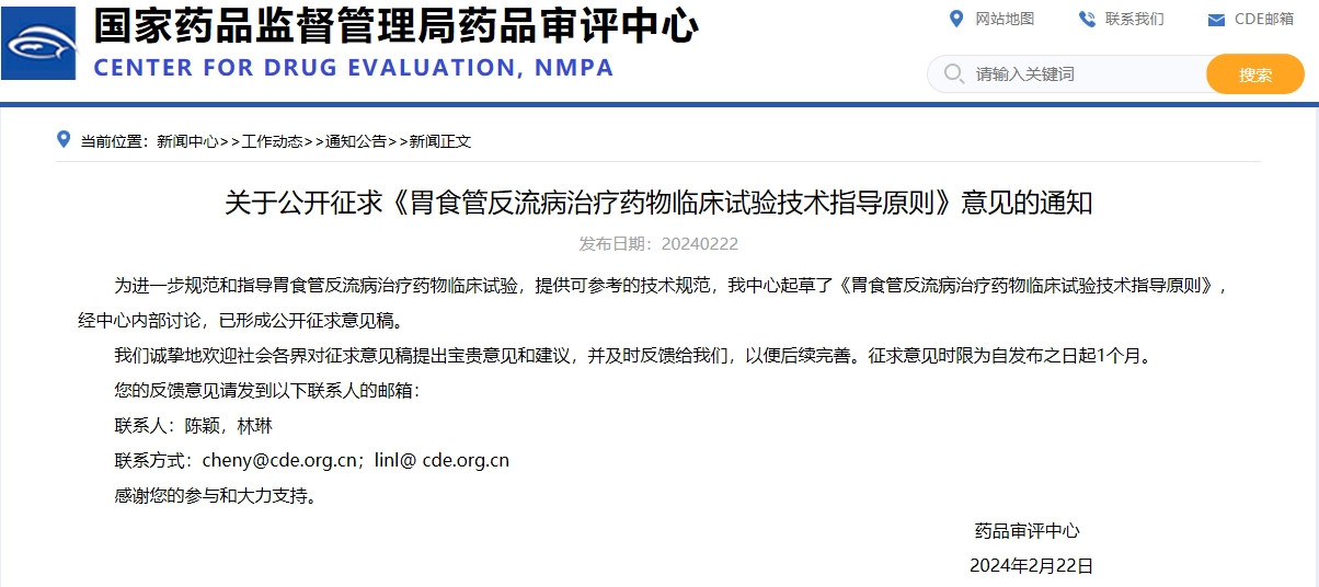 關(guān)于公開征求《胃食管反流病治療藥物臨床試驗技術(shù)指導(dǎo)原則》意見的通知