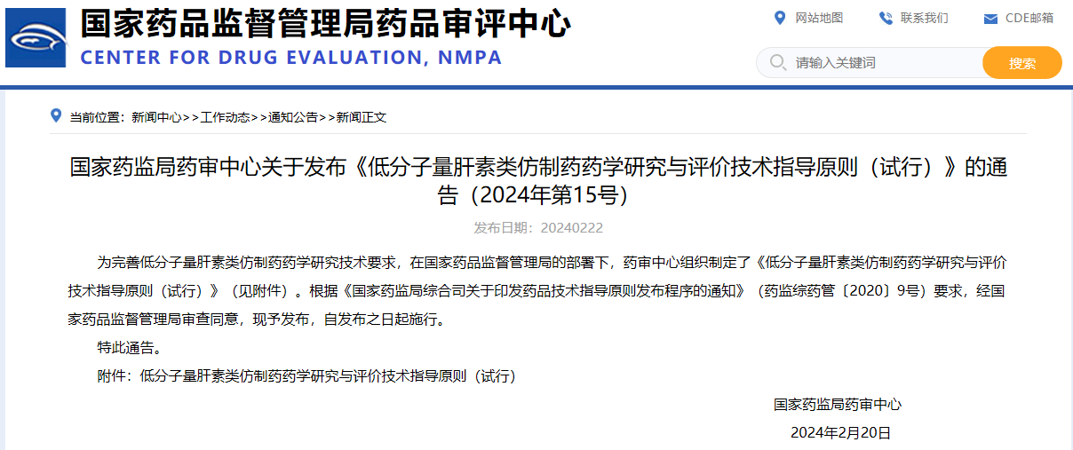 國家藥監(jiān)局藥審中心關(guān)于發(fā)布《低分子量肝素類仿制藥藥學(xué)研究與評價技術(shù)指導(dǎo)原則(試行)》的通告(2024年第15號)