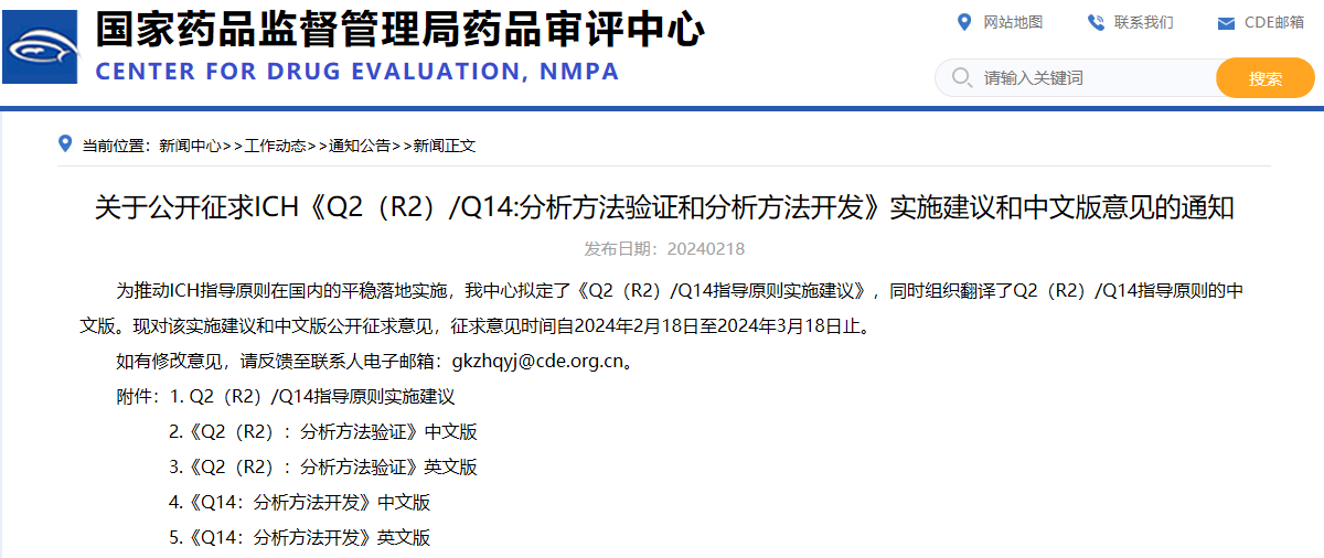 關(guān)于公開征求ICH《Q2(R2)/Q14:分析方法驗證和分析方法開發(fā)》實施建議和中文版意見的通知