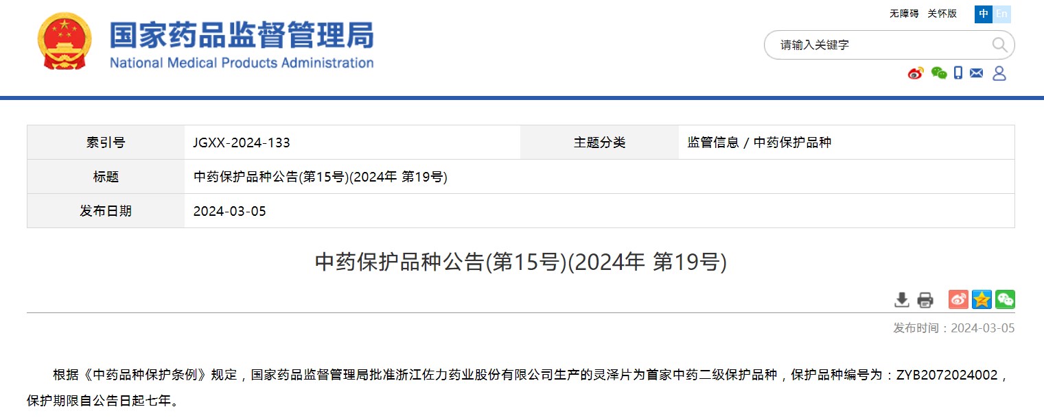 中藥保護(hù)品種公告(第15號(hào))(2024年 第19號(hào))