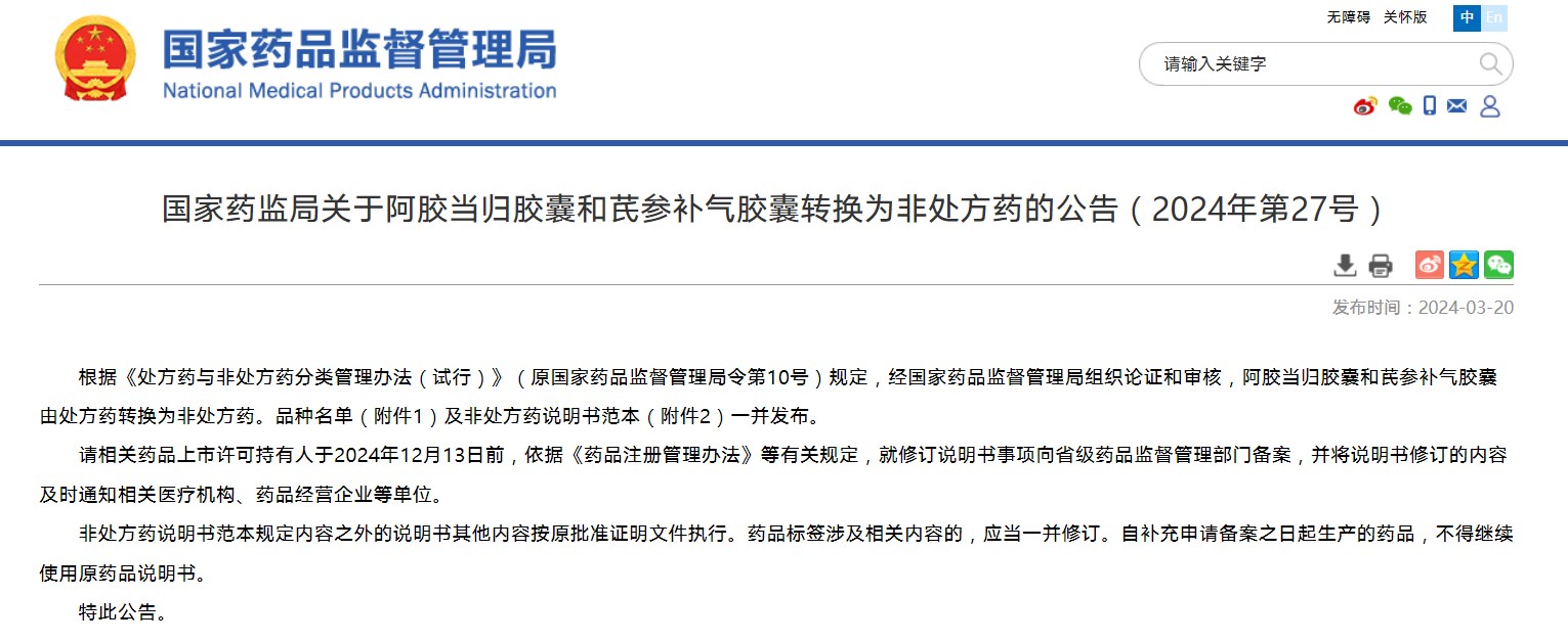 國家藥監(jiān)局關(guān)于阿膠當(dāng)歸膠囊和芪參補(bǔ)氣膠囊轉(zhuǎn)換為非處方藥的公告(2024年第27號(hào))