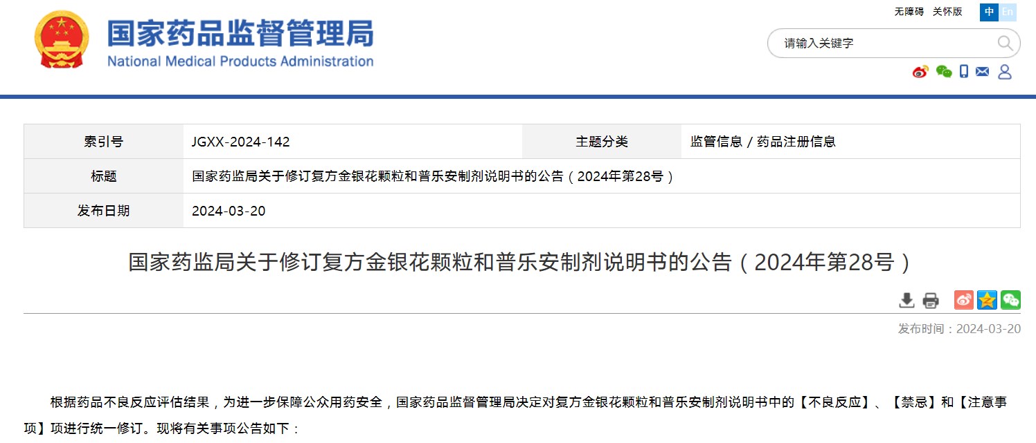 國家藥監(jiān)局關(guān)于修訂復(fù)方金銀花顆粒和普樂安制劑說明書的公告(2024年第28號(hào))