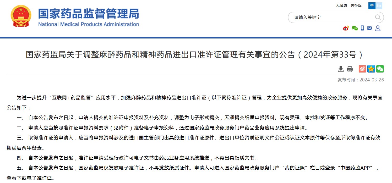 國家藥監(jiān)局關(guān)于調(diào)整麻醉藥品和精神藥品進出口準許證管理有關(guān)事宜的公告(2024年第33號)