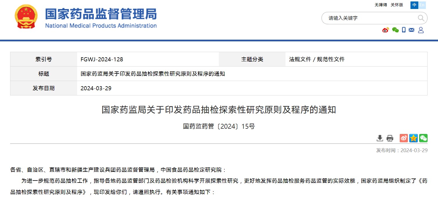 國家藥監(jiān)局關(guān)于印發(fā)藥品抽檢探索性研究原則及程序的通知