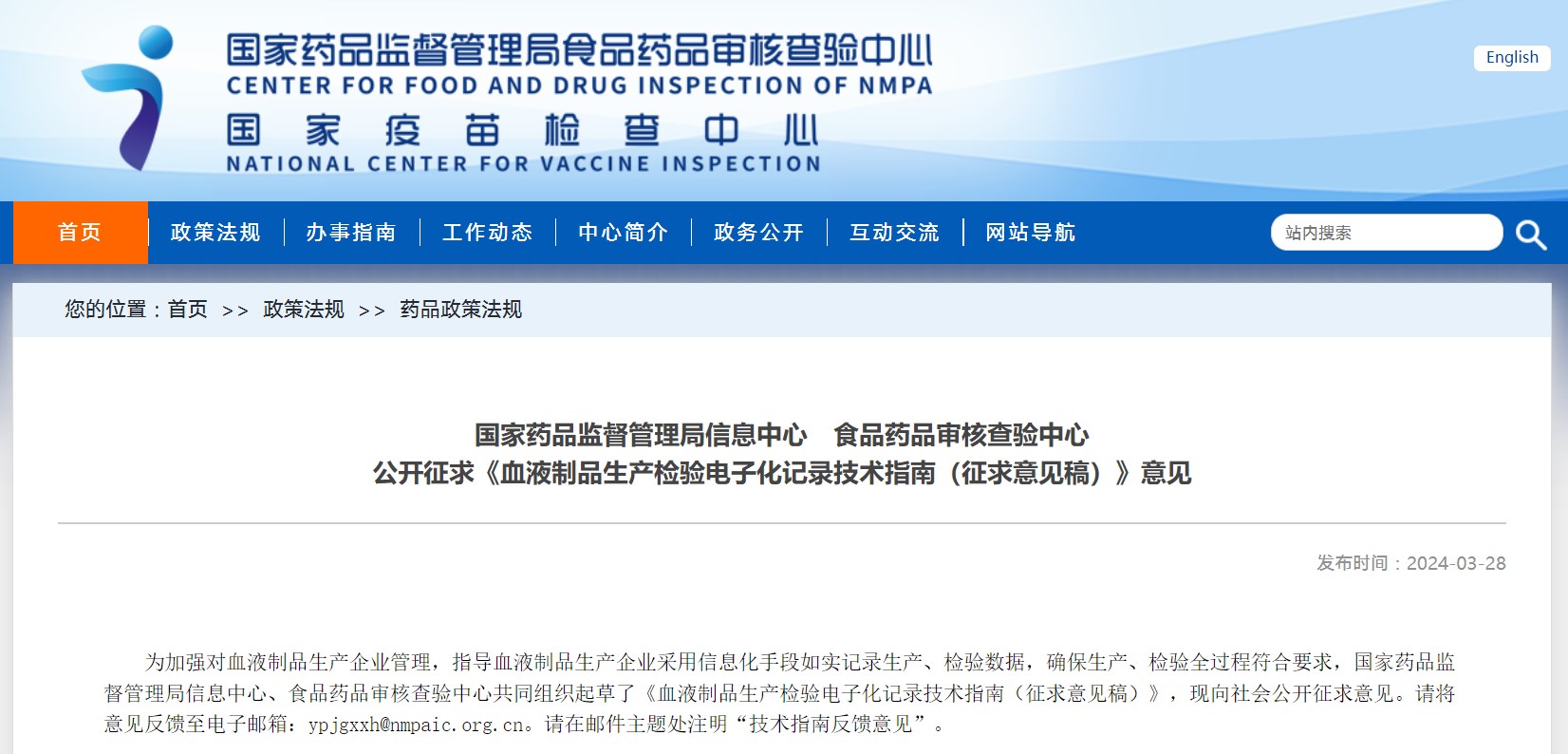 國家藥品監(jiān)督管理局信息中心 食品藥品審核查驗中心公開征求《血液制品生產(chǎn)檢驗電子化記錄技術(shù)指南(征求意見稿)》意見