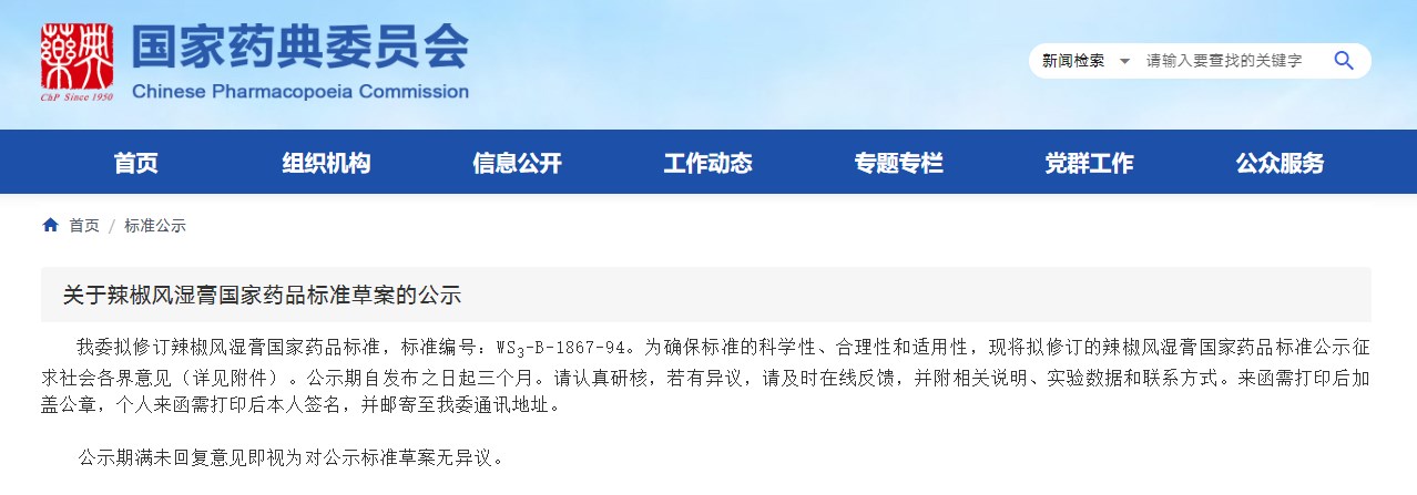關(guān)于辣椒風濕膏國家藥品標準草案的公示