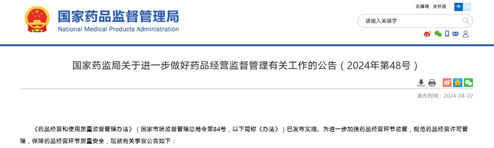 國(guó)家藥監(jiān)局關(guān)于進(jìn)一步做好藥品經(jīng)營(yíng)監(jiān)督管理有關(guān)工作的公告(2024年第48號(hào))