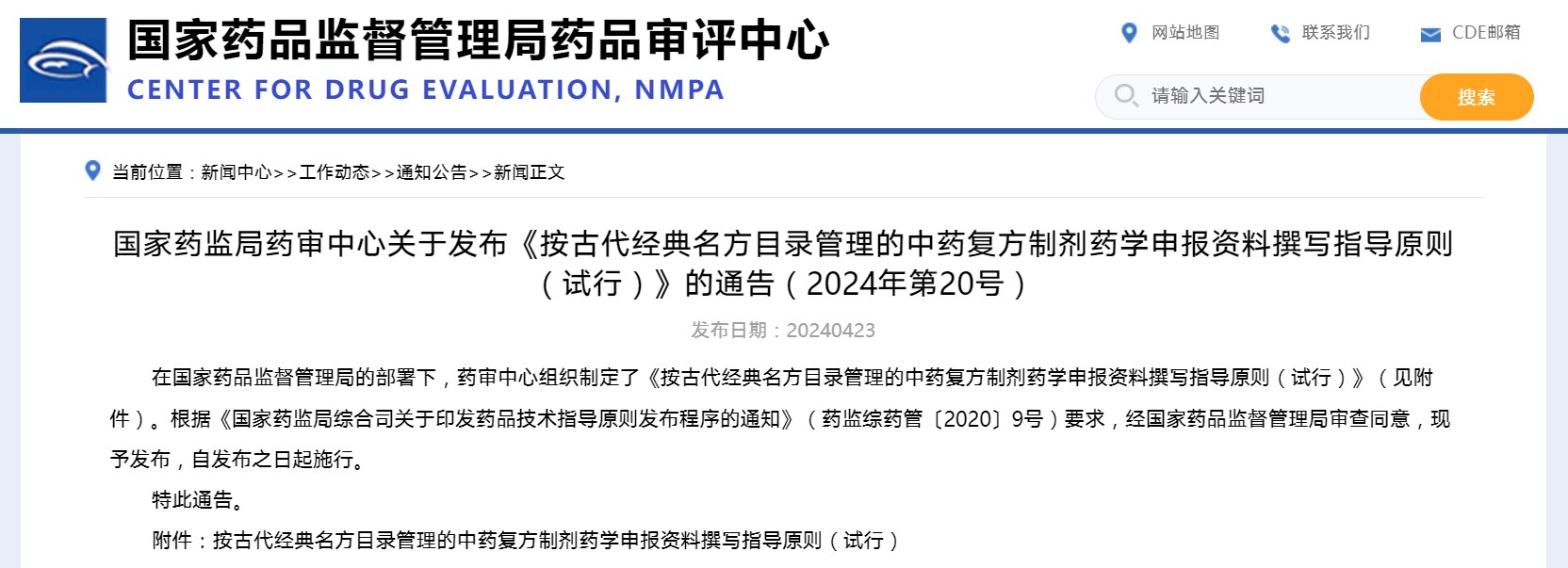 國(guó)家藥監(jiān)局藥審中心關(guān)于發(fā)布《按古代經(jīng)典名方目錄管理的中藥復(fù)方制劑藥學(xué)申報(bào)資料撰寫指導(dǎo)原則(試行)》的通告(2024年第20號(hào))