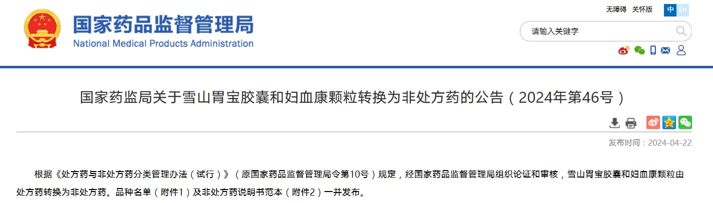 國(guó)家藥監(jiān)局關(guān)于雪山胃寶膠囊和婦血康顆粒轉(zhuǎn)換為非處方藥的公告(2024年第46號(hào))