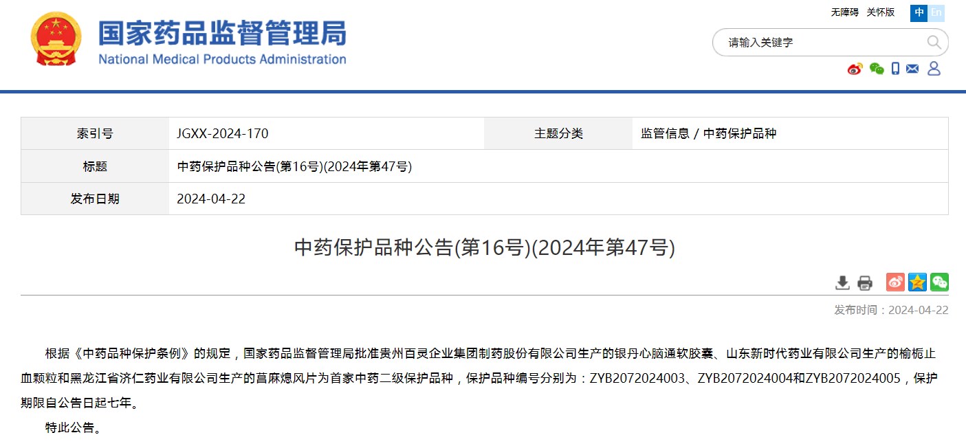 中藥保護(hù)品種公告(第16號(hào))(2024年第47號(hào))