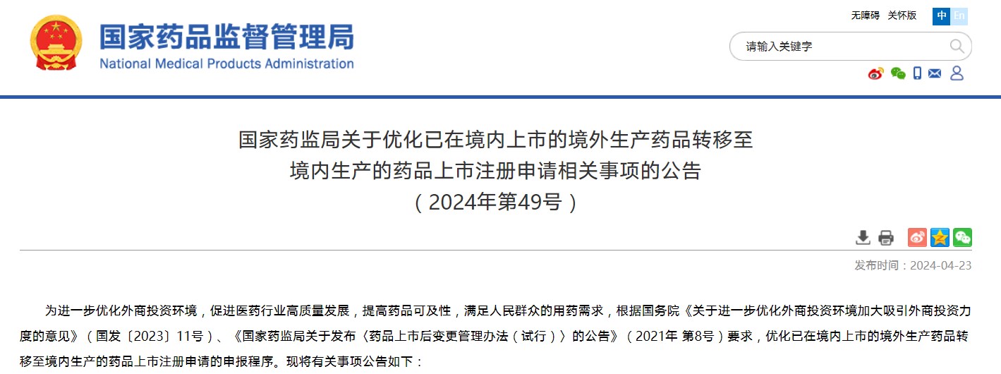 國(guó)家藥監(jiān)局關(guān)于優(yōu)化已在境內(nèi)上市的境外生產(chǎn)藥品轉(zhuǎn)移至境內(nèi)生產(chǎn)的藥品上市注冊(cè)申請(qǐng)相關(guān)事項(xiàng)的公告(2024年第49號(hào))