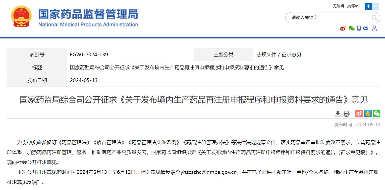 國(guó)家藥監(jiān)局綜合司公開(kāi)征求《關(guān)于發(fā)布境內(nèi)生產(chǎn)藥品再注冊(cè)申報(bào)程序和申報(bào)資料要求的通告》意見(jiàn)