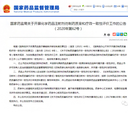 2020年5月14日,國家局一改往日習(xí)慣,在非假期前的工作日發(fā)布了重磅通告“國家藥監(jiān)局關(guān)于開展化學(xué)藥品注射劑仿制藥質(zhì)量和療效一致性評價工作的公告(2020年第62號)”(以下簡稱“通告”),與此同時,CDE同步發(fā)布《化學(xué)藥品注射劑仿制藥質(zhì)量和療效一致性評價技術(shù)要求》 -